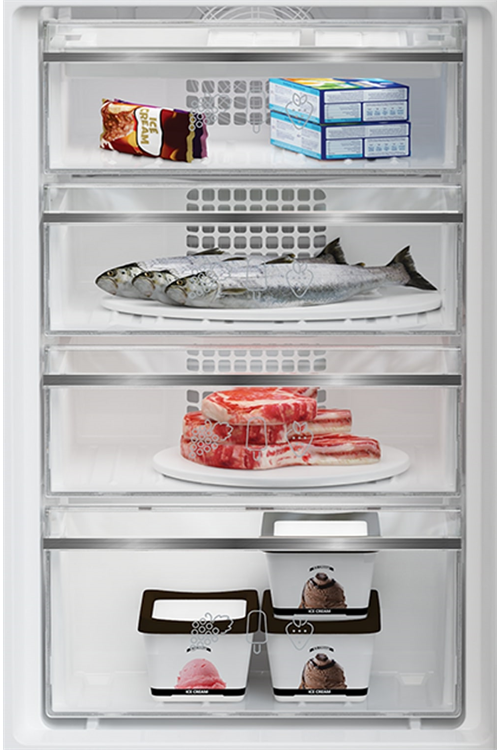 Additionally, four drawers are in the freezer section, making it easy to store bulky grocery specials. Made of transparent plastic, you'll quickly see what's inside at a glance. This Blomberg freezer has a four-star certification, so you may store frozen items for up to a year without worrying about spoilage.