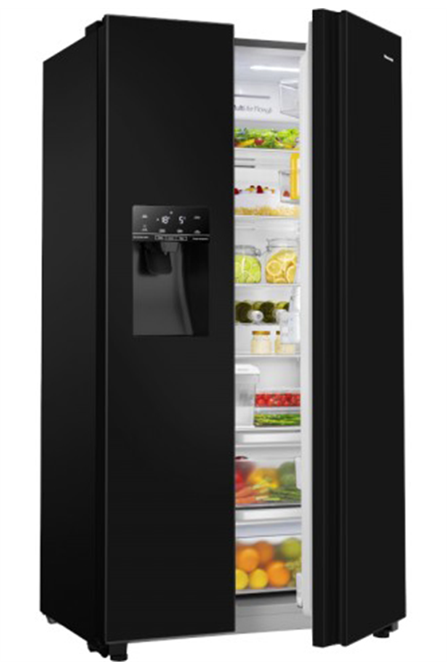 Buy the Hisense RS694N4TBE 535L Black American Style Fridge Freezer to make preparing and storing food easier and to ensure you have plenty of cool drinks on hand for the record-breaking heat of summer.