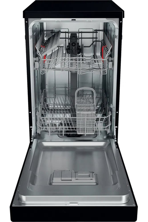 The Hotpoint HSFE1B19BUKN Black Slimline 10 Place Settings Dishwasher comes with an F energy rating, a 1-year warranty, and it features a handy delay timer.