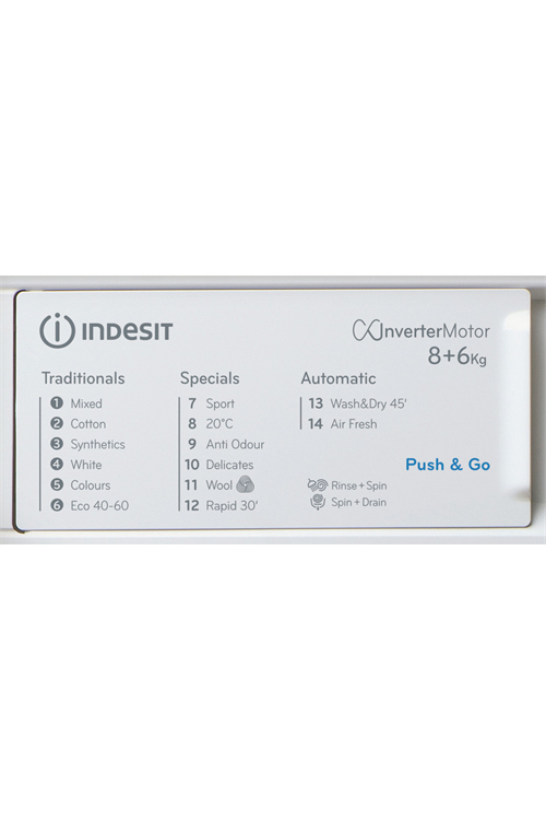 Choose the right cycle for you with this Indesit model, fully equipped with 16 pre-installed programmes that give you full flexibility to cater for your washing and drying needs, including:
