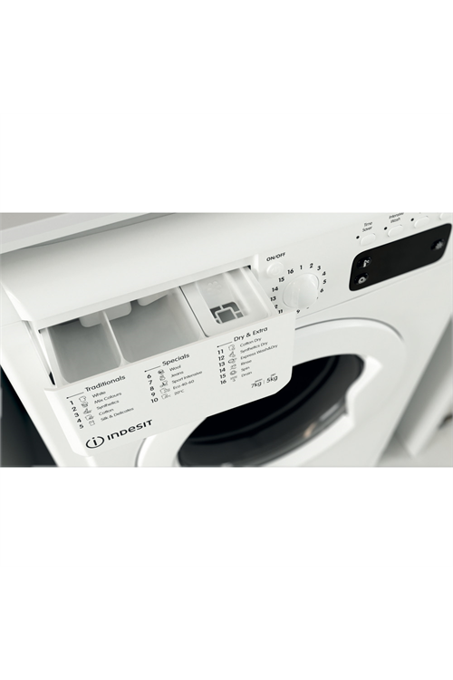 The user-friendly design and 16 programmes of this Indesit washer dryer makes running it a breeze. Use the simple knob controls to choose the ideal wash or dry cycle and temperature. It has a variety of programmes for all sorts of garment types, including: